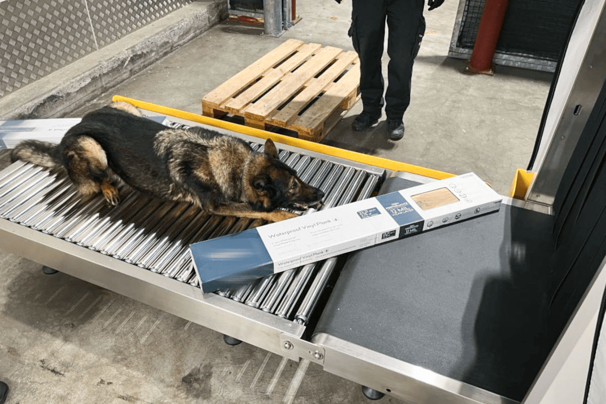 Die verdächtigen 144 Kartons waren auf vier Europaletten verteilt und als «wasserdichter Vinyl-Boden» beschriftet. Zur genaueren Überprüfung der Kartons zogen die Einsatzkräfte den Betäubungsmittelspürhund Iam hinzu, der kurz darauf auch anzeigte.
