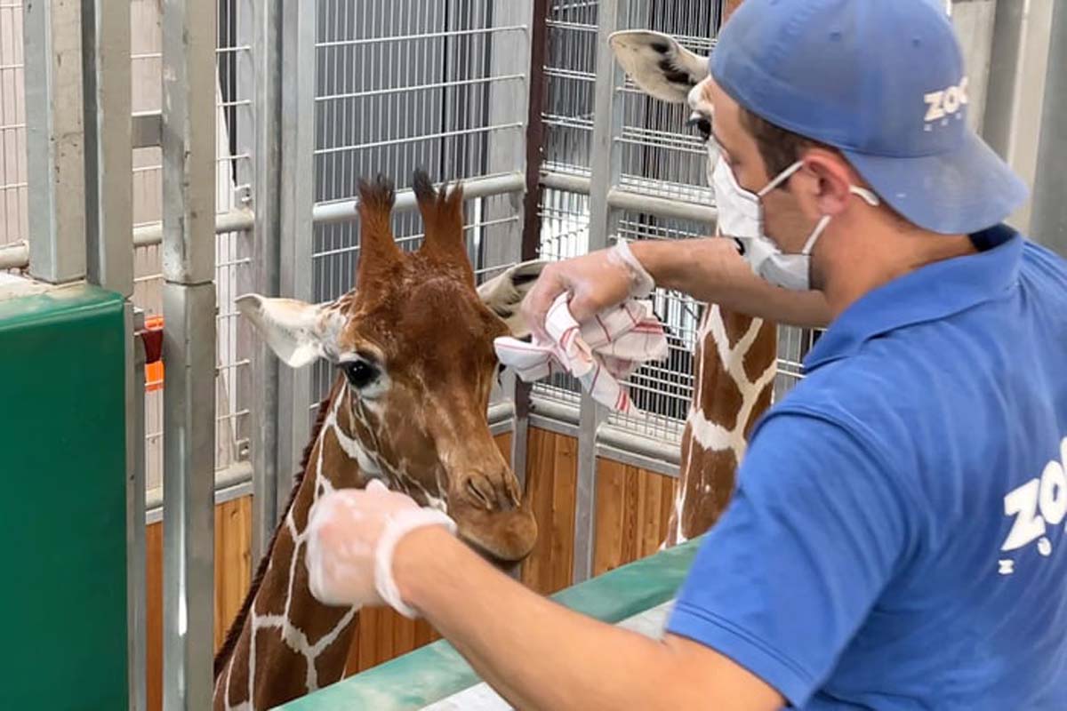 Tierpfleger Marco Brunner macht bei einer Netzgiraffe einen Abrieb für eine Geruchsprobe (Bildquelle: Zoo Zürich)