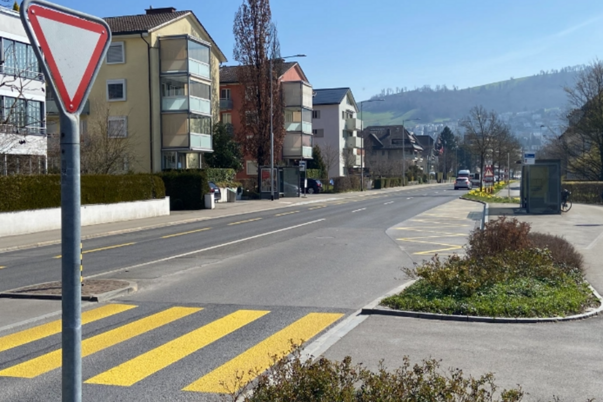 Die Bushaltestelle «Schutzengel» Richtung Zentrum wird um- und ausgebaut. Bei der Busbucht wird auf der ganzen Länge die Buskante erhöht. So wird der Komfort für ein- und aussteigende Fahrgäste verbessert: insbesondere für Gehbehinderte, Rollstuhlfahrende und Personen mit Kinderwagen. Der Fussgängerstreifen wird rund fünf Meter in Fahrtrichtung Zentrum verschoben und mit der Fahrradquerung zusammengelegt. Auch wird die Mittelinsel verbreitert. Mit diesen Massnahmen kann die Verkehrssicherheit für alle Verkehrsteilnehmenden wesentlich erhöht werden.