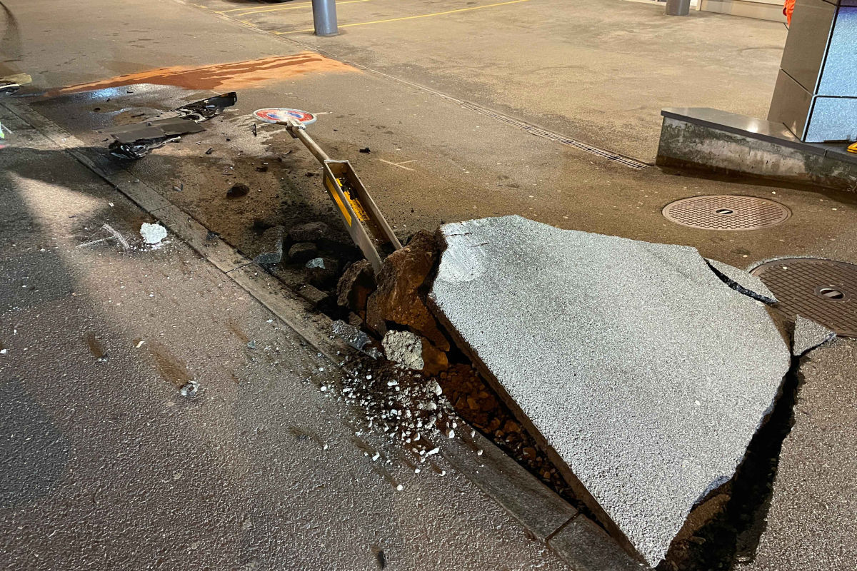 Die Parkverbotstafel wurde samt Verankerung aus dem Boden gerissen. Dadurch entstand auf dem Trottoir ein Loch mit einem Durchmesser von rund 1.5 Metern.