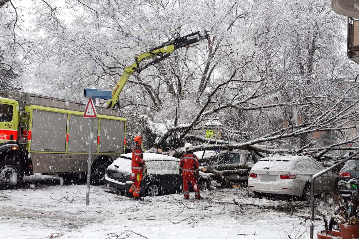 Unter den massiven Schneelasten brachen grosse Äste ab, ganze Bäume stürzten um und begruben zahlreiche Fahrzeuge und Gegenstände unter sich (Bildquelle: Schutz & Rettung Zürich)