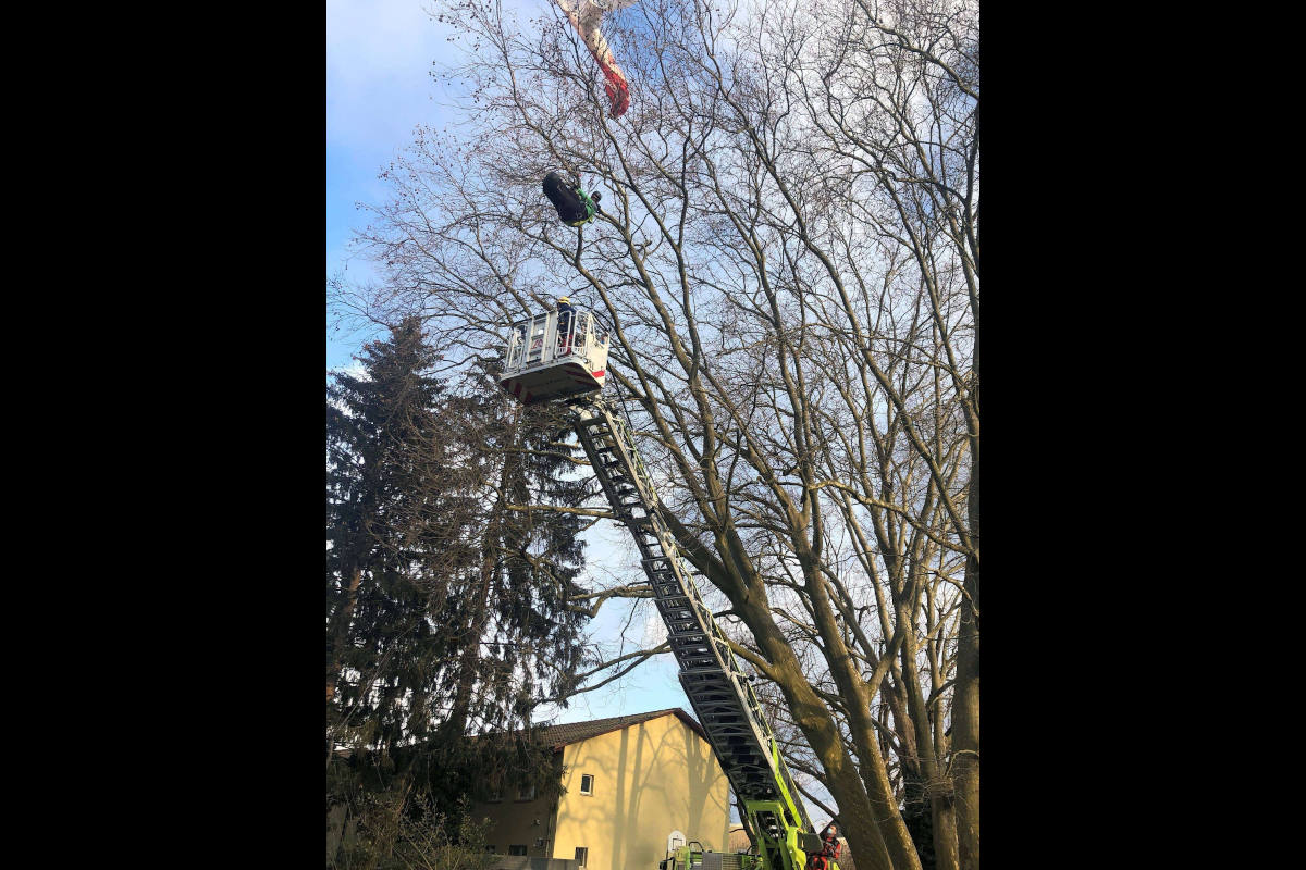 Mittels Autodrehleiter (ADL) befreiten sie den Mann aus einer Höhe von rund zehn Metern. Der Mann wurde vor Ort durch den Rettungsdienst von SRZ medizinisch erstversorgt. Er blieb unverletzt. Die Unfallursache wird abgeklärt. Neben der Berufsfeuerwehr und der Sanität von SRZ stand die Stadtpolizei Zürich im Einsatz.