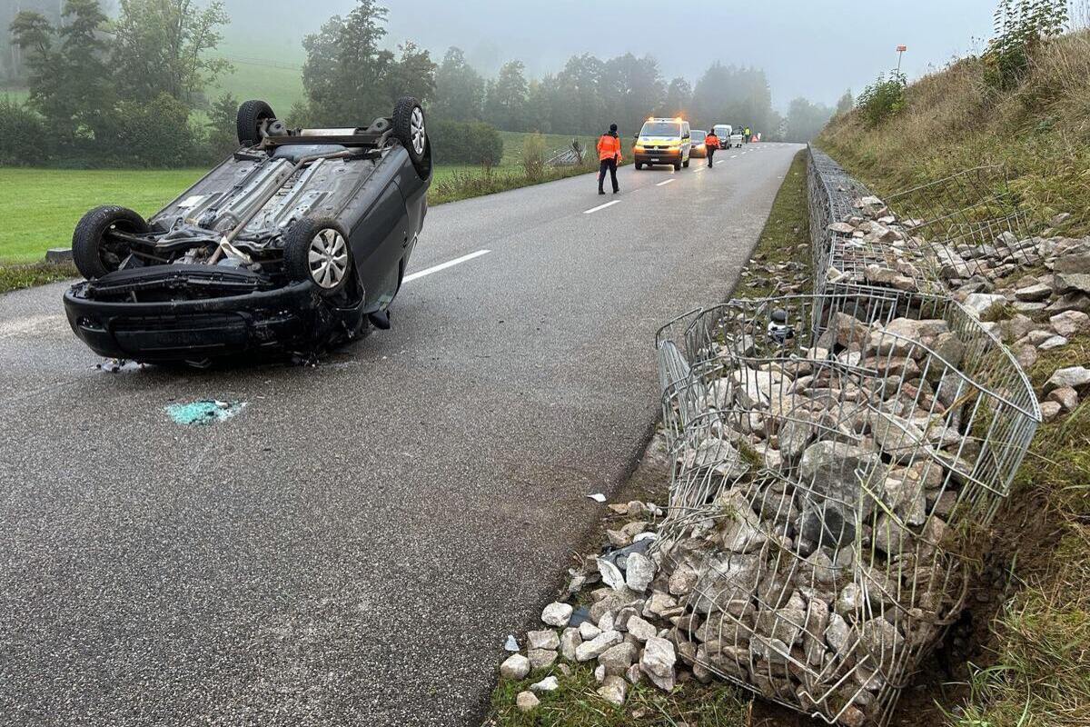 Der Selbstunfall ereignete sich am Samstag, 5. Oktober 2024, kurz nach sieben Uhr auf der Hauptstrasse zwischen Hellikon und Zuzgen. In Richtung Zuzgen fahrend kam die 35-jährige Lenkerin eines Citroën rechts von der Fahrbahn ab und prallte heftig gegen eine Stützmauer aus Steinkörben. In der Folge überschlug sich der Kleinwagen und blieb mitten auf der Strasse auf dem Dach liegen.