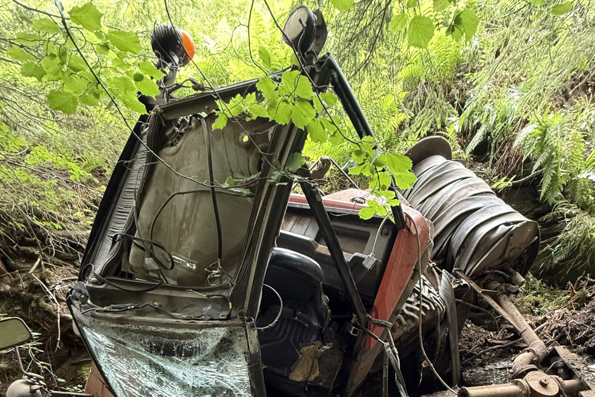 Auf der feuchtnassen, abschüssigen Wiese geriet das Fahrzeug beim Abwärtsfahren ins Schleudern und rutschte über mehrere hundert Meter hinweg einen steilen Abhang hinunter.