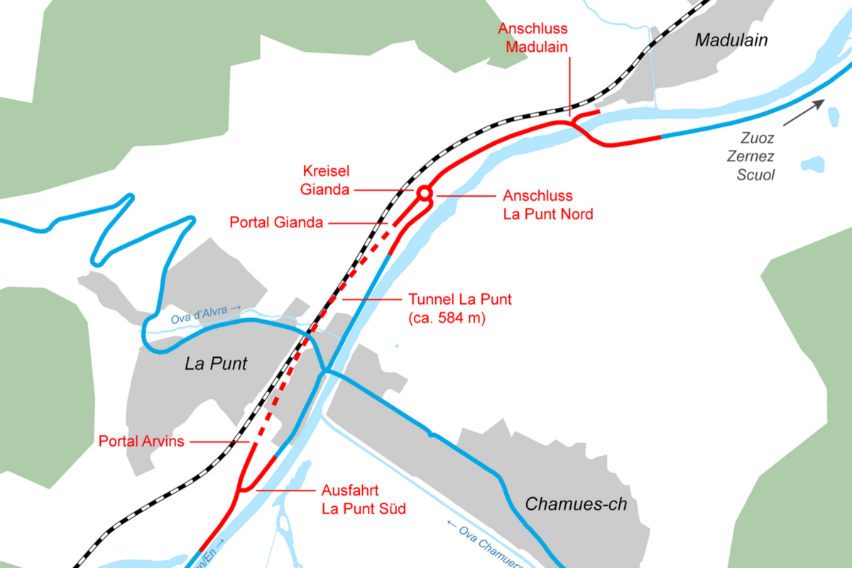 Die Länge des gesamten Umfahrungsprojekts beträgt 1,9 Kilometer. Ein 584 Meter langer Tunnel – das Herzstück des Projekts – unterquert das Dorfzentrum von La Punt Chamues-ch. Die Kosten für die Umfahrung La Punt betragen 80 Millionen Franken.