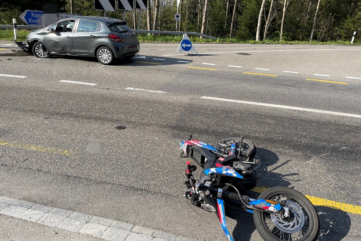 Der 18-jährige Motorradfahrer wurde beim Unfall mittelschwer verletzt und musste durch den Rettungsdienst ins Spital gebracht werden. Der 19-jährige Autofahrer blieb unverletzt. An den Fahrzeugen entstand Sachschaden von mehreren tausend Franken.