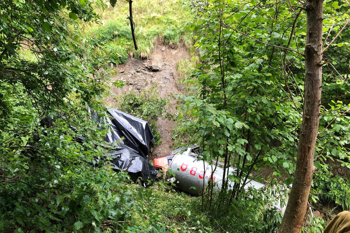 Nach einer führerlosen Strecke von knapp zehn Metern erreichte es ein Tobel, überschlug sich mehrmals und kam in einem Bach zum Stillstand. Aus dem beschädigten Druckfass flossen gut tausend Liter Gülle aus und gelangten in den sowie ins Erdreich.