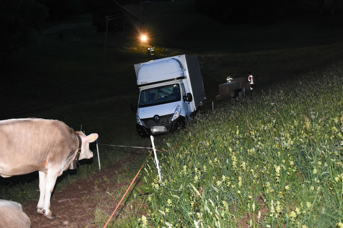 Der 44-Jährige war mit einer Möbellieferung auf der Bödemstrasse unterwegs. Auf Höhe der Bödemstrasse 7 bog er auf einen steilen Wiesenweg ab. Laut eigenen Angaben zeigte ihm sein Navi diesen Weg an. Am Ende des Weges fuhr der Mann ein steiles Wiesengelände hinunter, wo der Lieferwagen schliesslich stecken blieb.