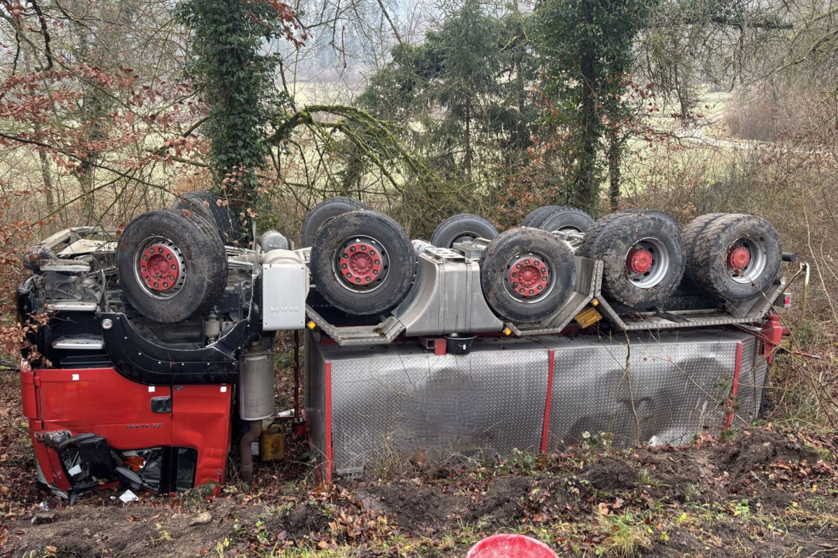 Heute Morgen, 19. Dezember 2025, kam es bei Hallau zu einem Unfall mit einem Lastwagen. Der LKW überschlug sich und blieb auf dem Dach liegen. Der Chauffeur konnte sich selbst aus dem Fahrzeug befreien.