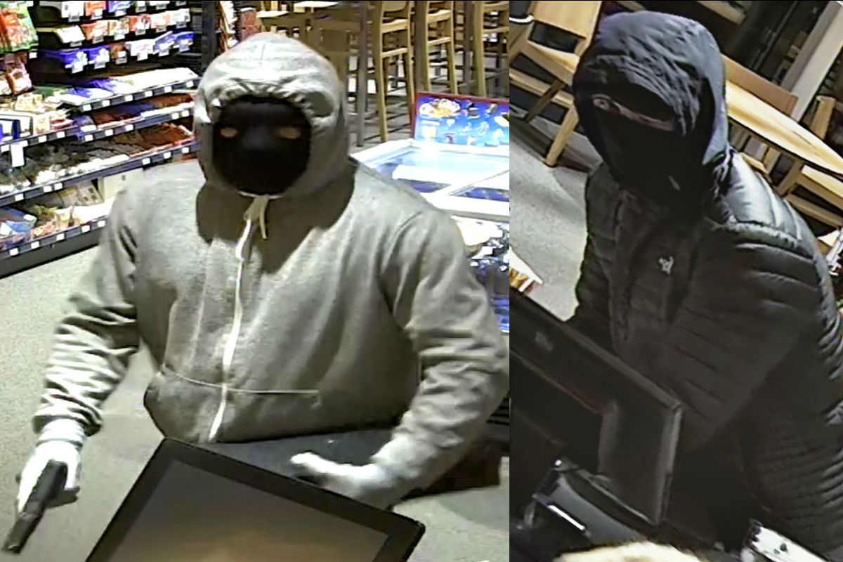 Unbekannter Mann, ca. 170 cm gross, mittlere Statur, trug helle Jacke mit Kapuze, Jeans, dunkle Schuhe mit hellem Sohlenrand und helle Handschuhe. Er trug eine schwarze Maske mit Augenlöchern und war mit einer dunklen Faustfeuerwaffe bewaffnet.