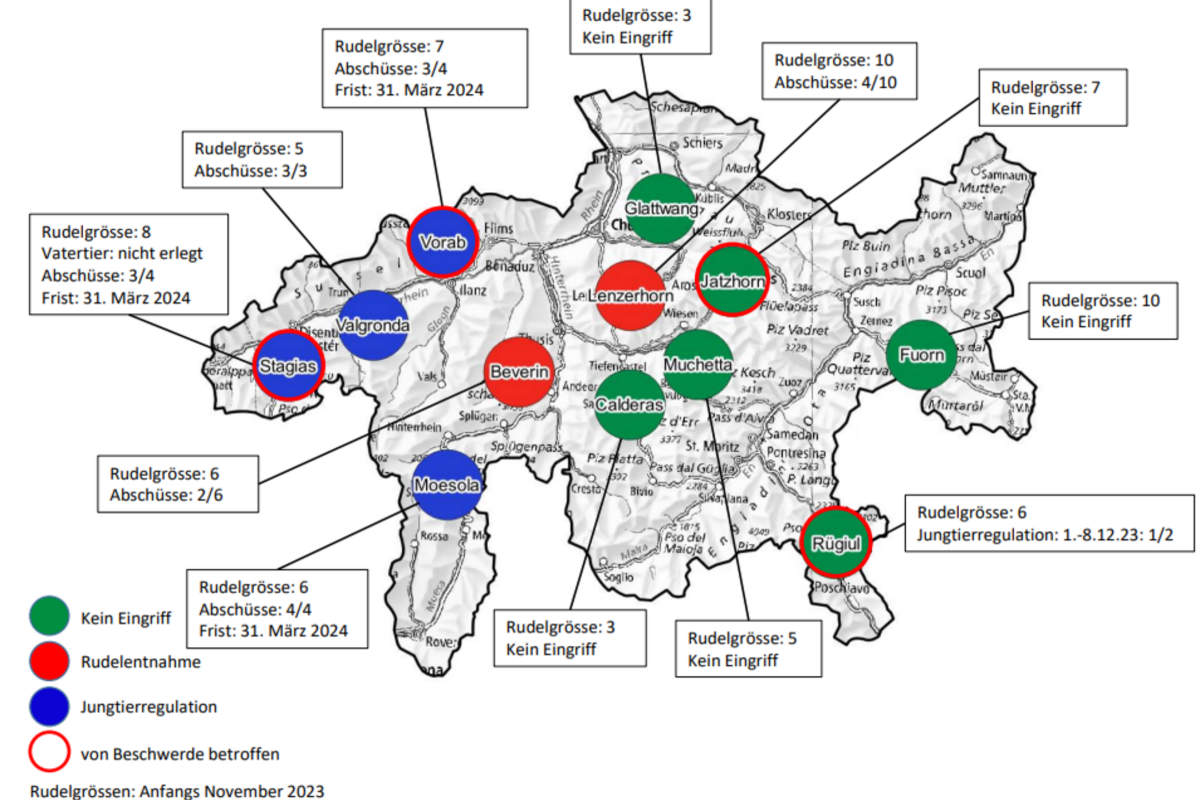 Der Kanton Graubünden hatte bis Ende November 2023 im Rahmen sogenannter reaktiver Abschussbewilligungen den Abschuss von 17 Wölfen aus fünf Wolfsrudeln verfügt. Basierend auf der revidierten Jagdgesetzgebung und mit Bewilligung des Bundesamts für Umwelt verfügte der Kanton Ende November über die proaktive Regulierung den Abschuss von weiteren 27 Wölfen. Geplant war dabei die vollständige Entnahme der Wolfsrudel Stagias, Vorab, Beverin und Lenzerhorn sowie die Regulierung der beiden Rudel Jatzhorn und Rügiul.