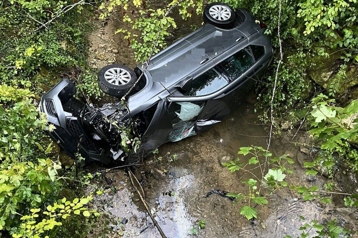 Der stark beschädigte Personenwagen musste durch ein Abschleppunternehmen aus dem Bachbett geborgen, aufgeladen und abtransportiert werden.