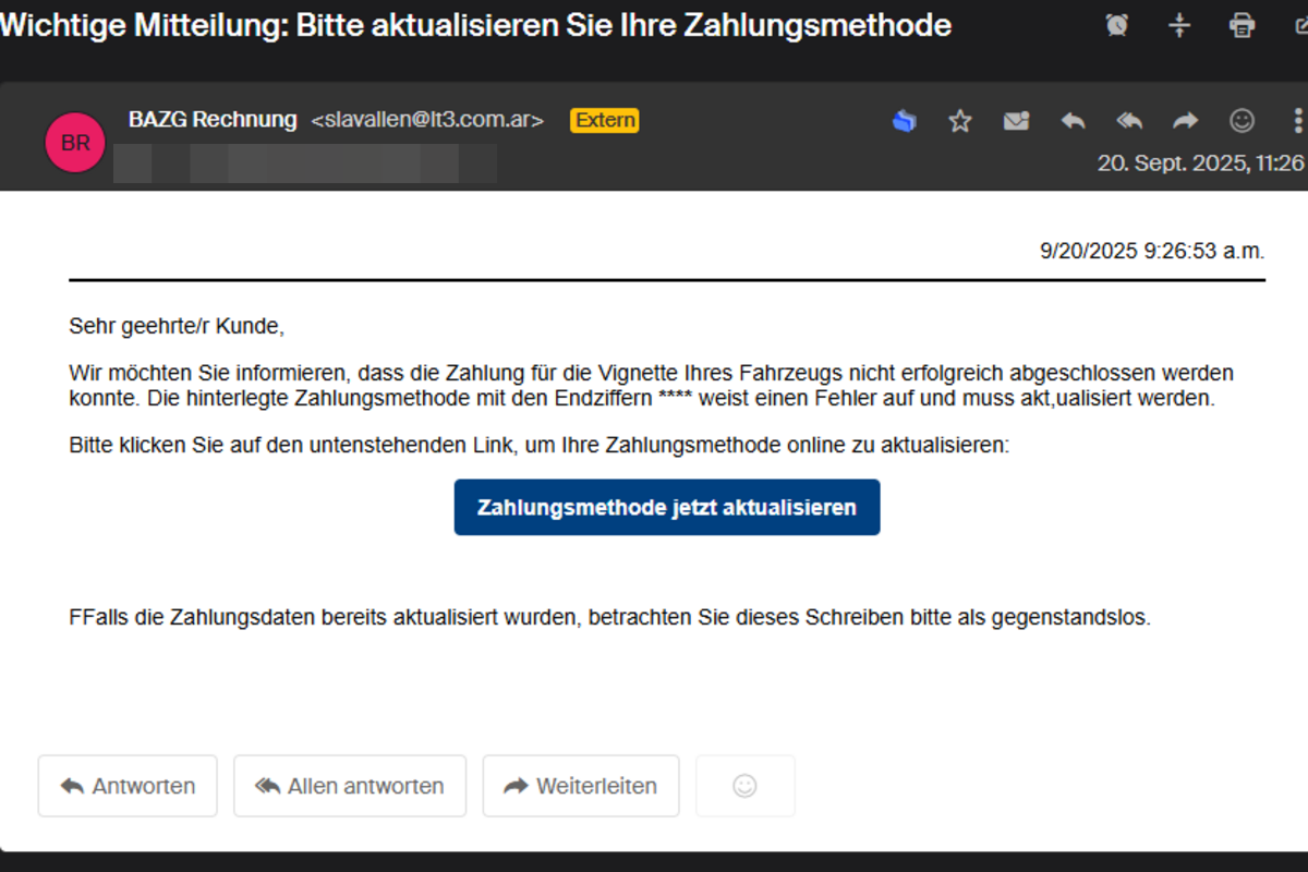Aktuell kursiert eine E-Mail, die angeblich vom Bundesamt für Zoll und Grenzsicherheit (BAZG) stammt. Unter dem Betreff «Wichtige Mitteilung: Bitte aktualisieren Sie Ihre Zahlungsmethode» behaupten die Absender, die Zahlung für eine Autobahnvignette sei fehlgeschlagen. Empfängerinnen und Empfänger werden aufgefordert, ihre Zahlungsdaten über einen Link zu aktualisieren.
