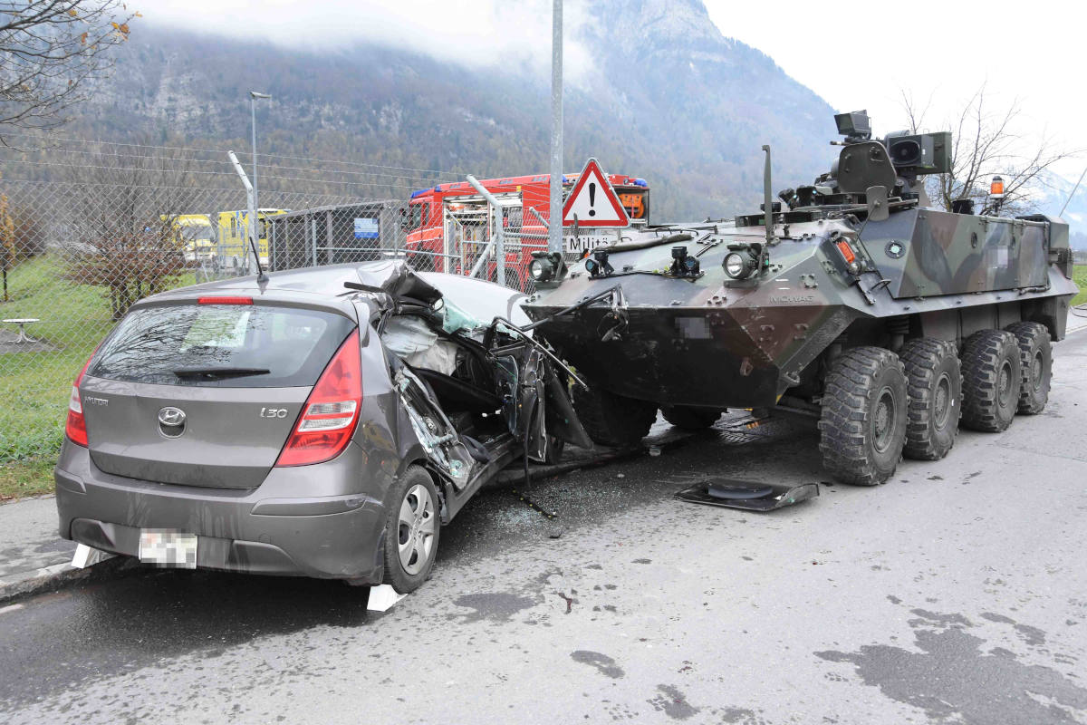 Durch den Unfall wurde die 85-jährige Frau schwer verletzt. Ein Helikopter der Luftrettung AP3 flog die Frau ins Spital. Der 85-jährige Autofahrer erlitt eher leichte Verletzungen. Er wurde durch einen Rettungswagen ins Spital gefahren. Der 24-Jährige und die Besatzung des Radschützenpanzers blieben unverletzt.