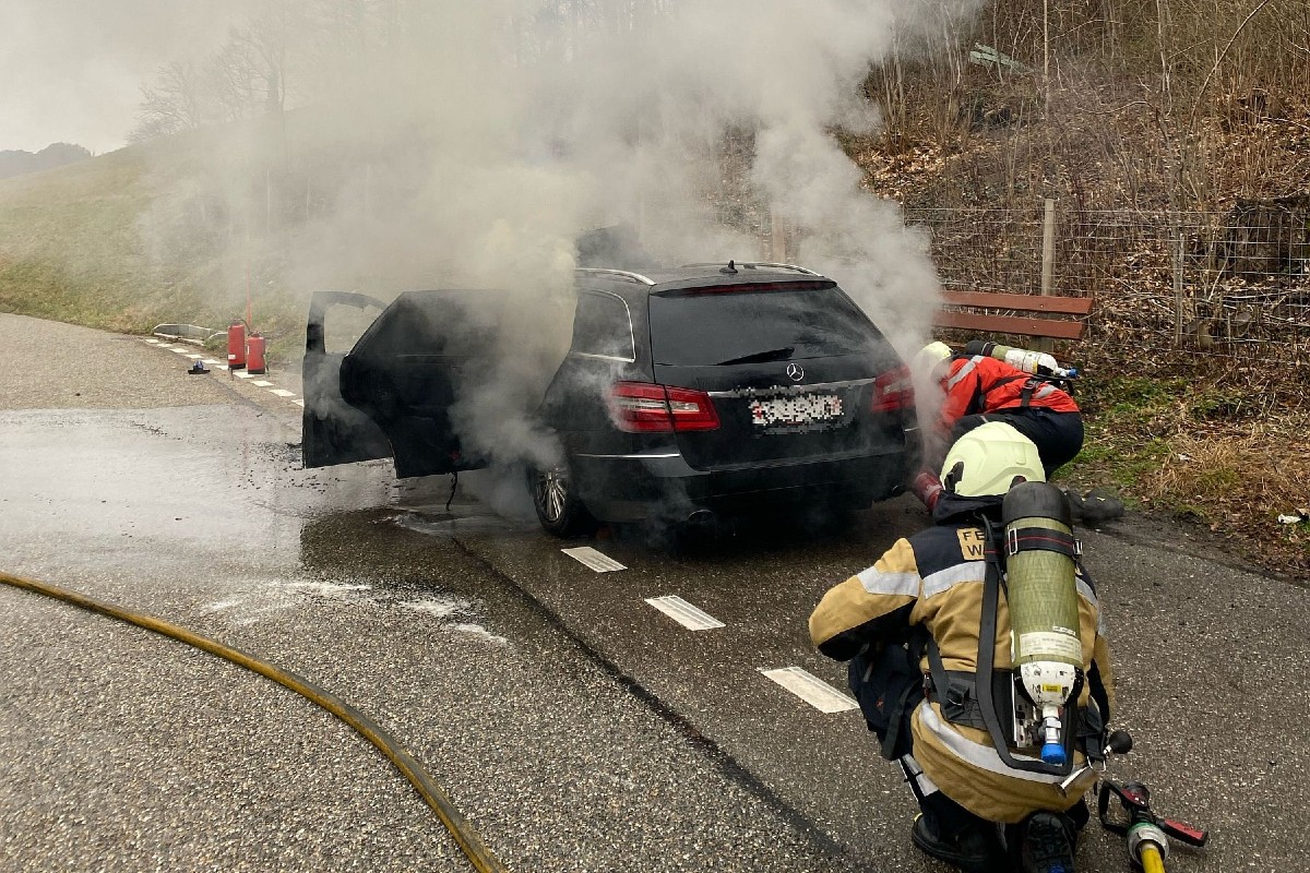Beim Eintreffen der Feuerwehr stand der schwarze Mercedes, welcher zuvor von Liedertswil