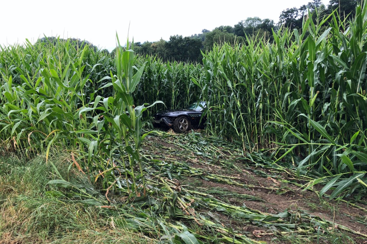 In Schüpfen BE durchbrach heute ein Auto auf der Autobahn einen Zaun und landete im Maisfeld. (Bildquelle: Kantonspolizei Bern)