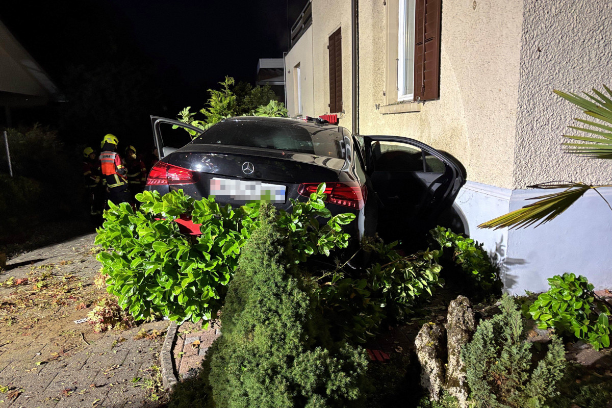 Mercedes einen Baum und prallte dann heftig gegen die Fassade des Nachbarhauses.