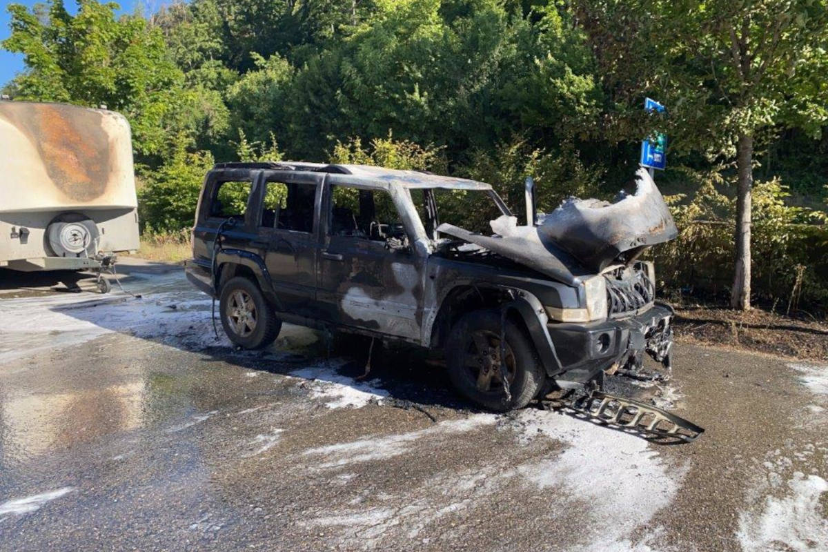 Auto mit Pferdeanhänger fängt während der Fahrt an zu brennen (Bildquelle: SHPol)