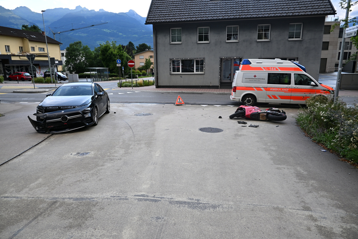 Bei einem Unfall zwischen einem Auto und einem Motorrad wurde in Schaan am Montagabend, 14.07.2025, eine Frau verletzt. Sie musste mit Beinverletzungen ins Spital gebracht werden.