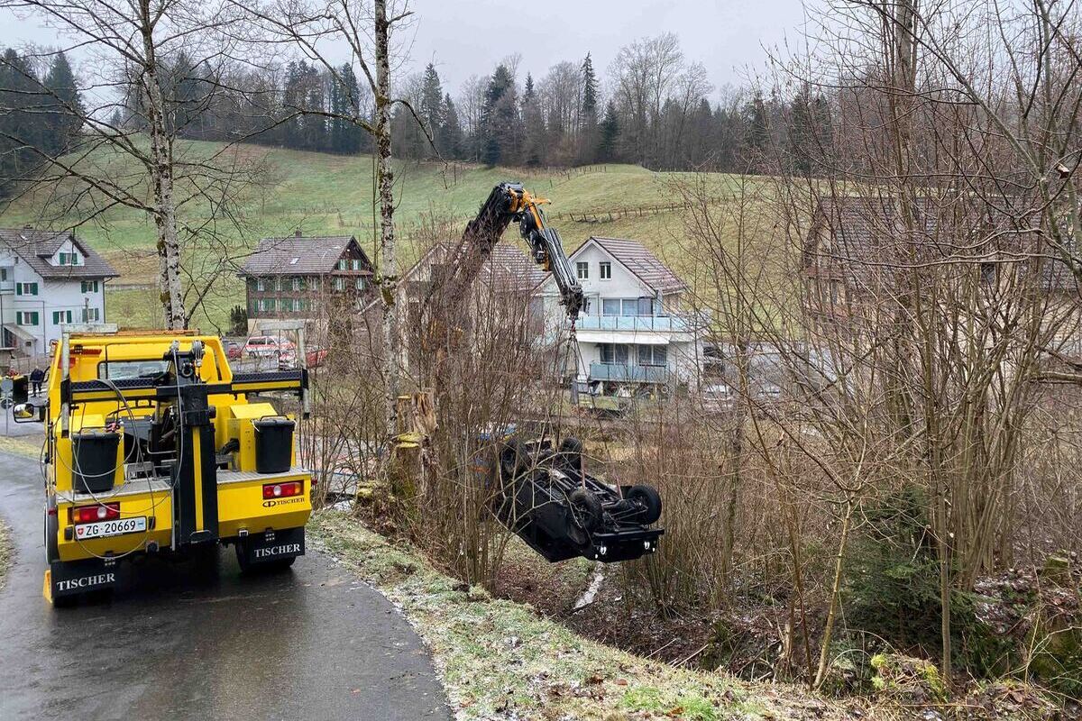 Ein Selbstunfall ereignete sich am Donnerstagmorgen (25. Dezember 2025), kurz vor 11:15 Uhr, im Bereich der Wisstanneggen in Neuägeri (Gemeinde Unterägeri). Ein Auto, das bergwärts unterwegs war, kam ins Rutschen und stürzte eine Böschung hinunter.