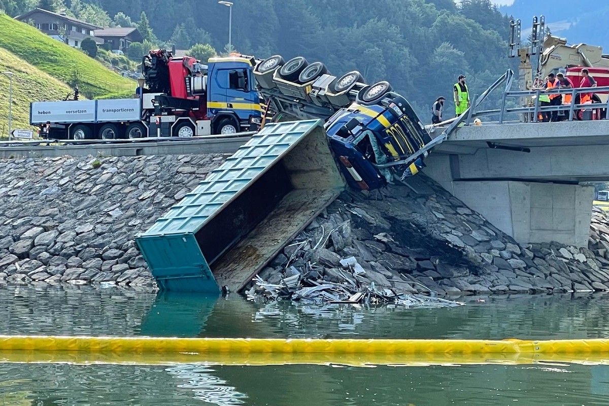 Die Kantonspolizei steht unter anderem mit Polizeitauchern im Einsatz, welche die Fracht, die aus Abbruchmaterial besteht und in den See gefallen ist,